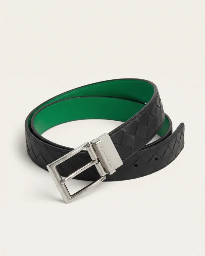 Bottega Veneta Reversible Intrecciato Belt in Black & Green with Silver Buckle