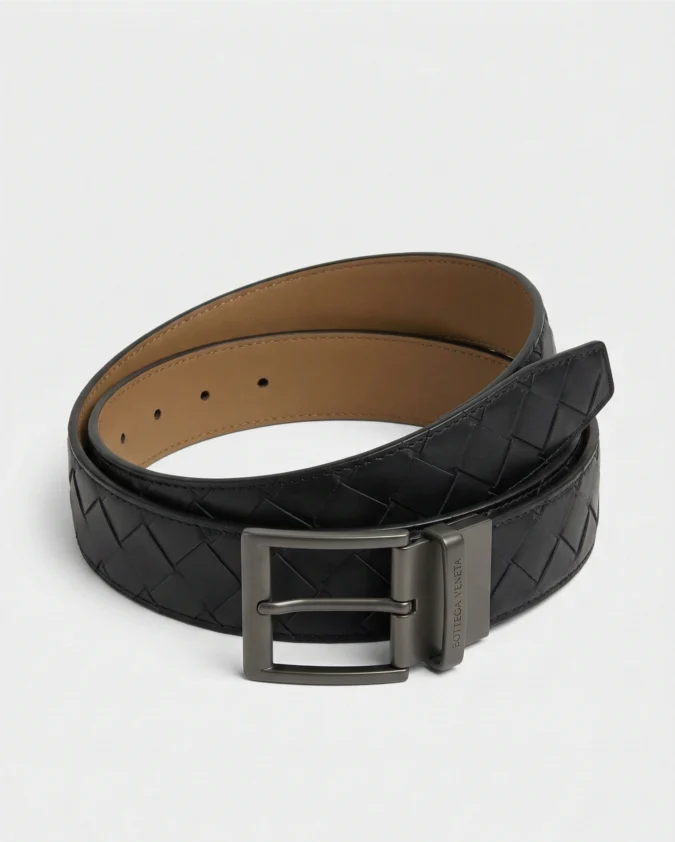 Bottega Veneta Intrecciato Black Leather Belt with Gunmetal Square Buckle