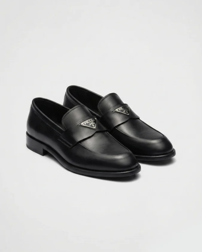 Prada Brushed Leather Loafers with Enamel Triangle Logo