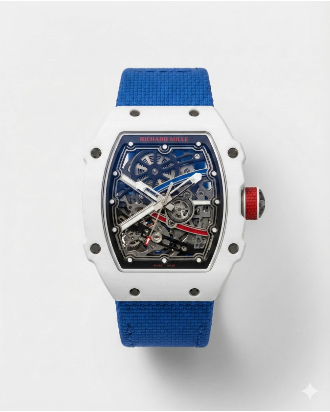Brand:Richard Mille Model:RM 055 Reference number:Rm055 Movement Manual winding Case material :Ceramic Bracelet material:Rubber Case material:Ceramic Case diameter :49.9 x 42.7 mm Water resistance:3 ATM Bezel material:Ceramic Crystal Sapphire:crystal Dial:Skeletonized