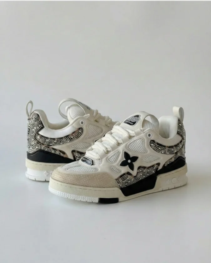 د.إ850.00This ultra-luxurious rendition of the LV Skate sneaker is meticulously embellished with shimmering Swarovski™ crystals over a crisp white technical base. Drawing heavy inspiration from Nineties' skate culture, the design is characterized by its exaggerated, chunky silhouette and an ultra-padded collar for a bold, retro-sportswear look.
