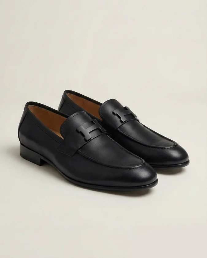 This specific model departs from traditional metallic finishes, featuring the iconic "H" buckle in a sleek matte black finish. This "so black" aesthetic creates a streamlined, contemporary profile that is both understated and unmistakably prestigious. With its elegant apron-toe stitching and slim silhouette, these loafers bridge the gap between avant-garde minimalism and classic Parisian heritage.