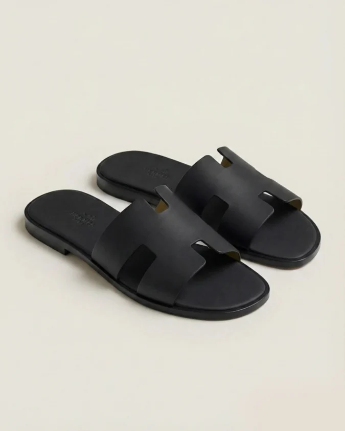 The design is centered around the instantly recognizable "H" cut-out vamp, providing a bold yet minimalist statement of Parisian elegance. This specific iteration features a matching black leather insole and outsole, creating a seamless, streamlined profile that transitions effortlessly from high-end resort wear to chic urban ensembles. With its flat silhouette and breathable open-toe construction, the Oran sandal remains the gold standard for understated, timeless style.