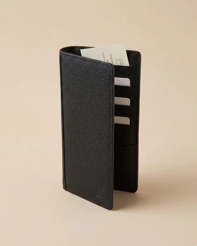 Design & Silhouette: A compact, envelope-style trifold wallet designed to maximize storage while remaining slim enough to fit into a small handbag or pocket.