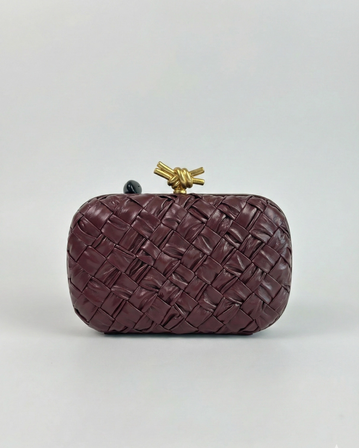 Silhouette: Rounded rectangular box clutch with a rigid, structured frame.