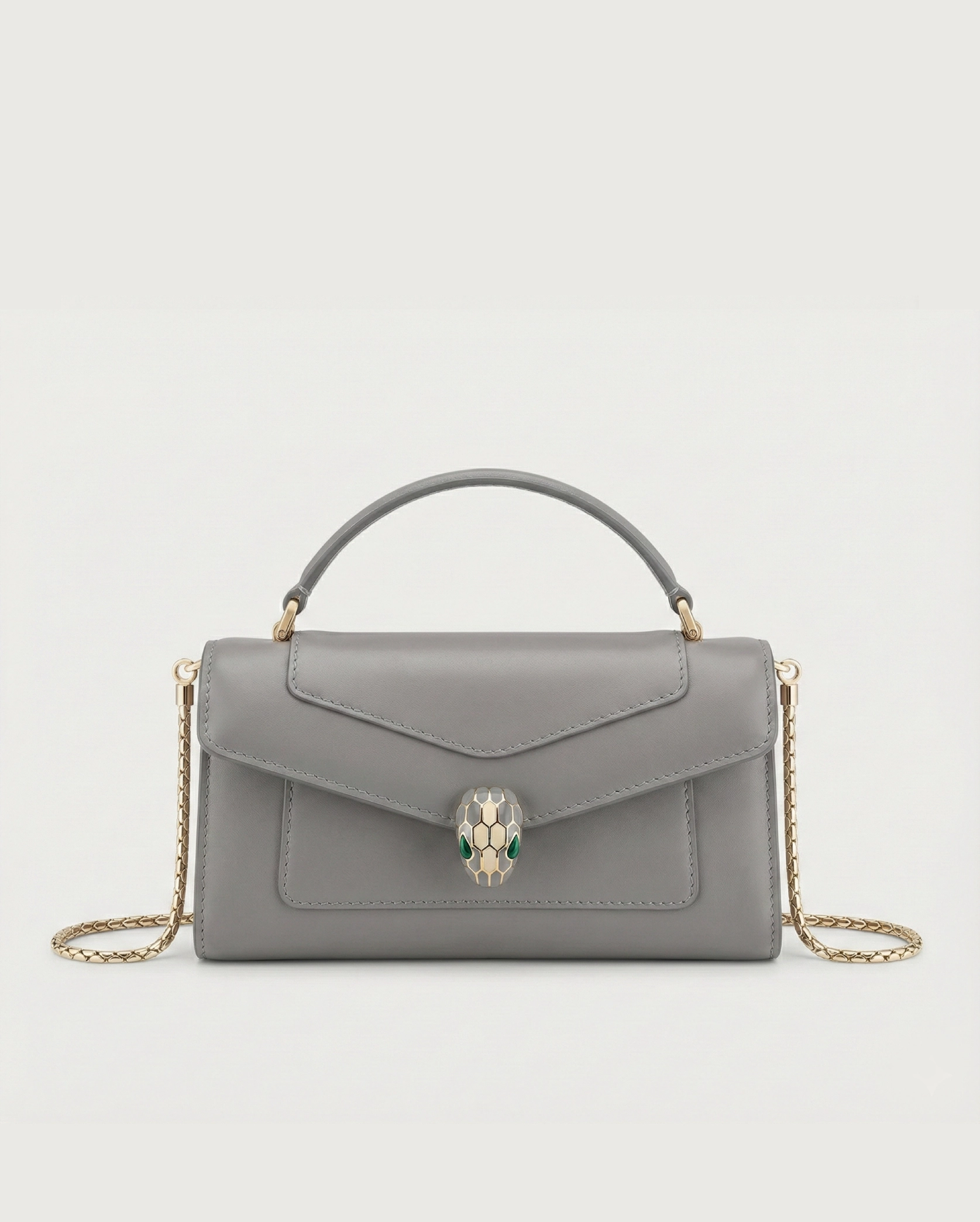 Serpenti Head: Light gold-plated brass closure featuring enamel scales.