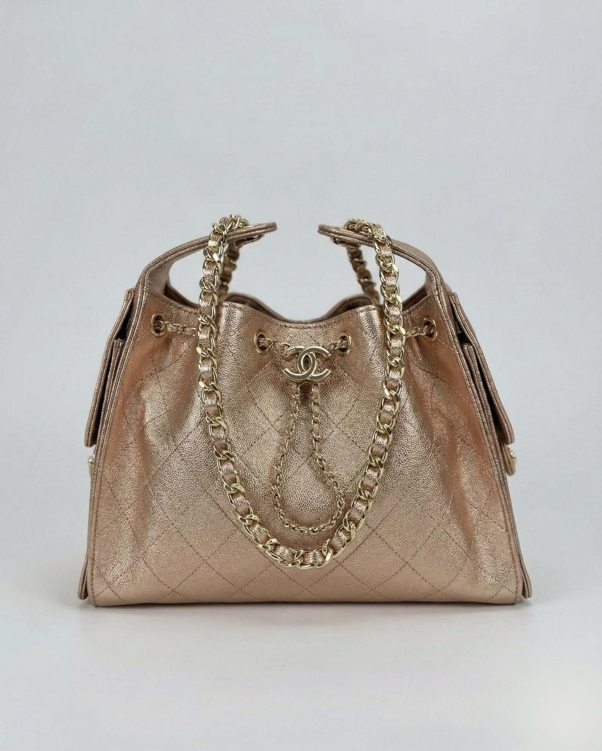 A secure drawstring closure featuring a prominent gold-tone CC logo at the center.