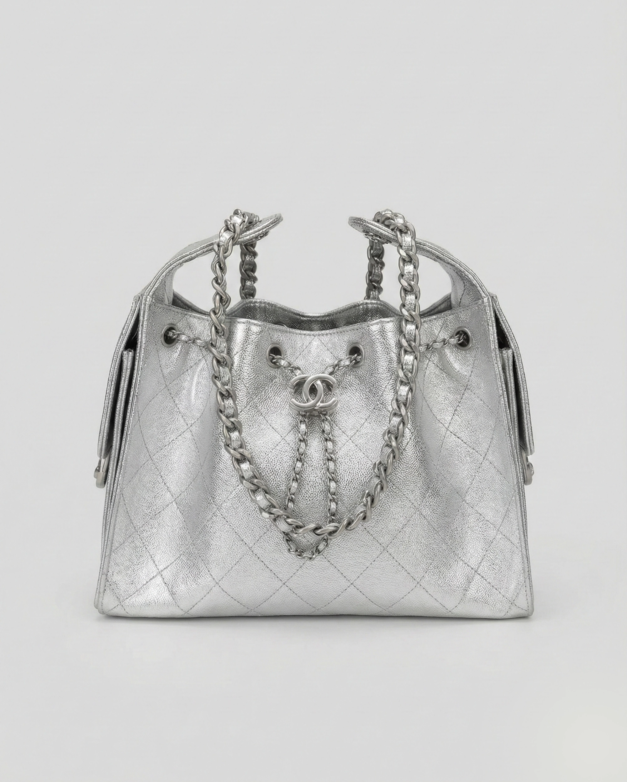 A secure drawstring closure featuring a prominent gold-tone CC logo at the center.