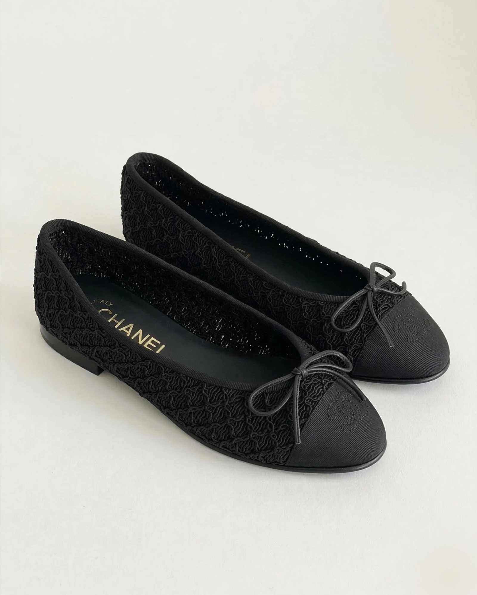 A fresh, breathable take on the classic Chanel flat. This pair is crafted from delicate black mesh with a structured grosgrain toe cap and the signature interlocking CC logo. Finished with a dainty bow, these ballerinas offer a lightweight, romantic aesthetic for sophisticated daily wear.