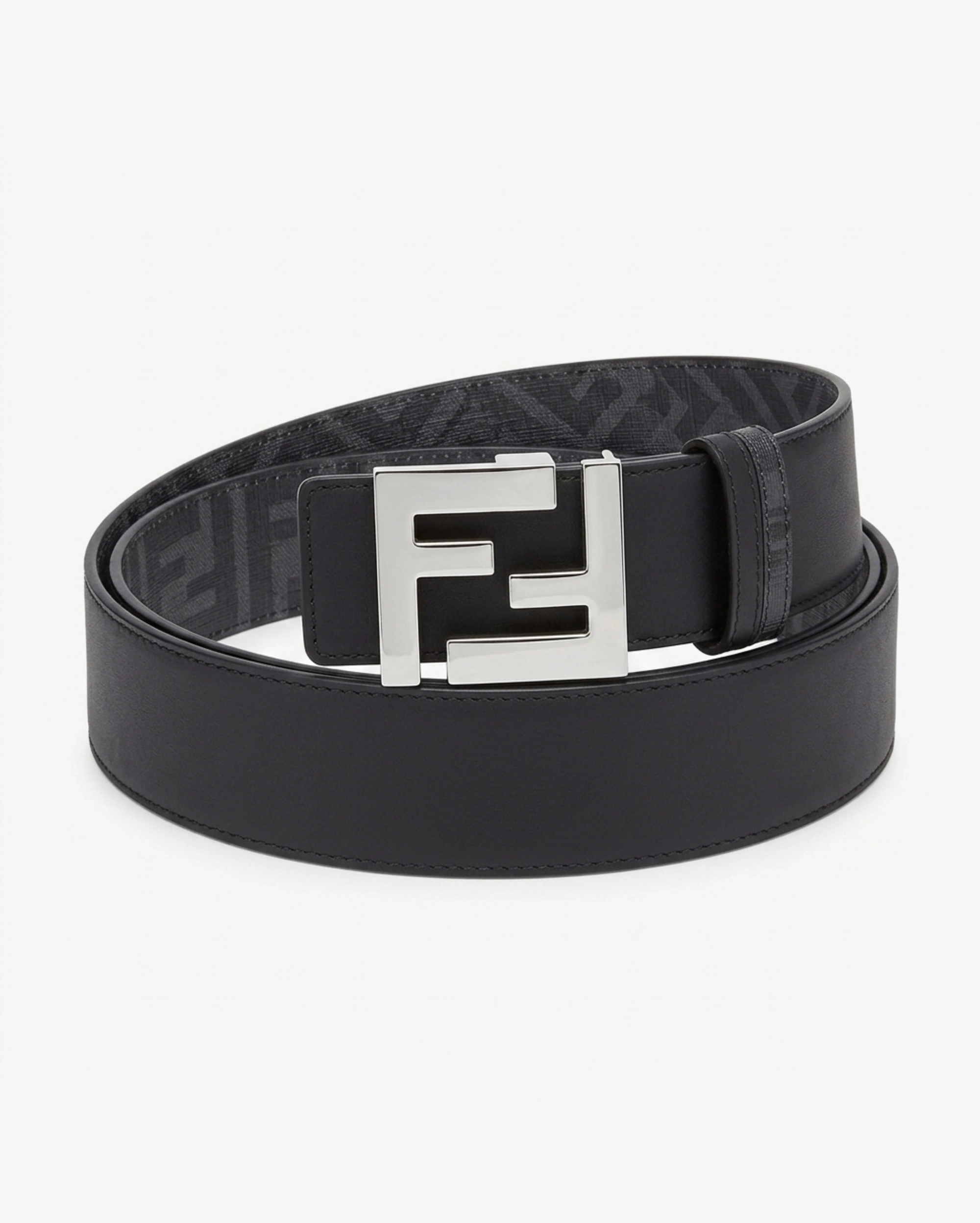Fendi FF Logo Black Leather Belt with Polished Silver Buckle