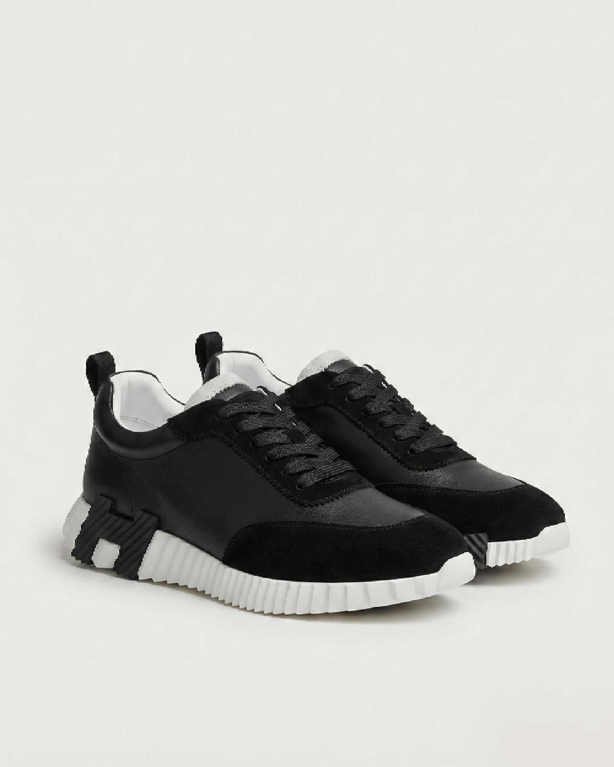 Hermès Bouncing Sneaker in Black Leather and Suede with Contrast White Architectural Sole.
