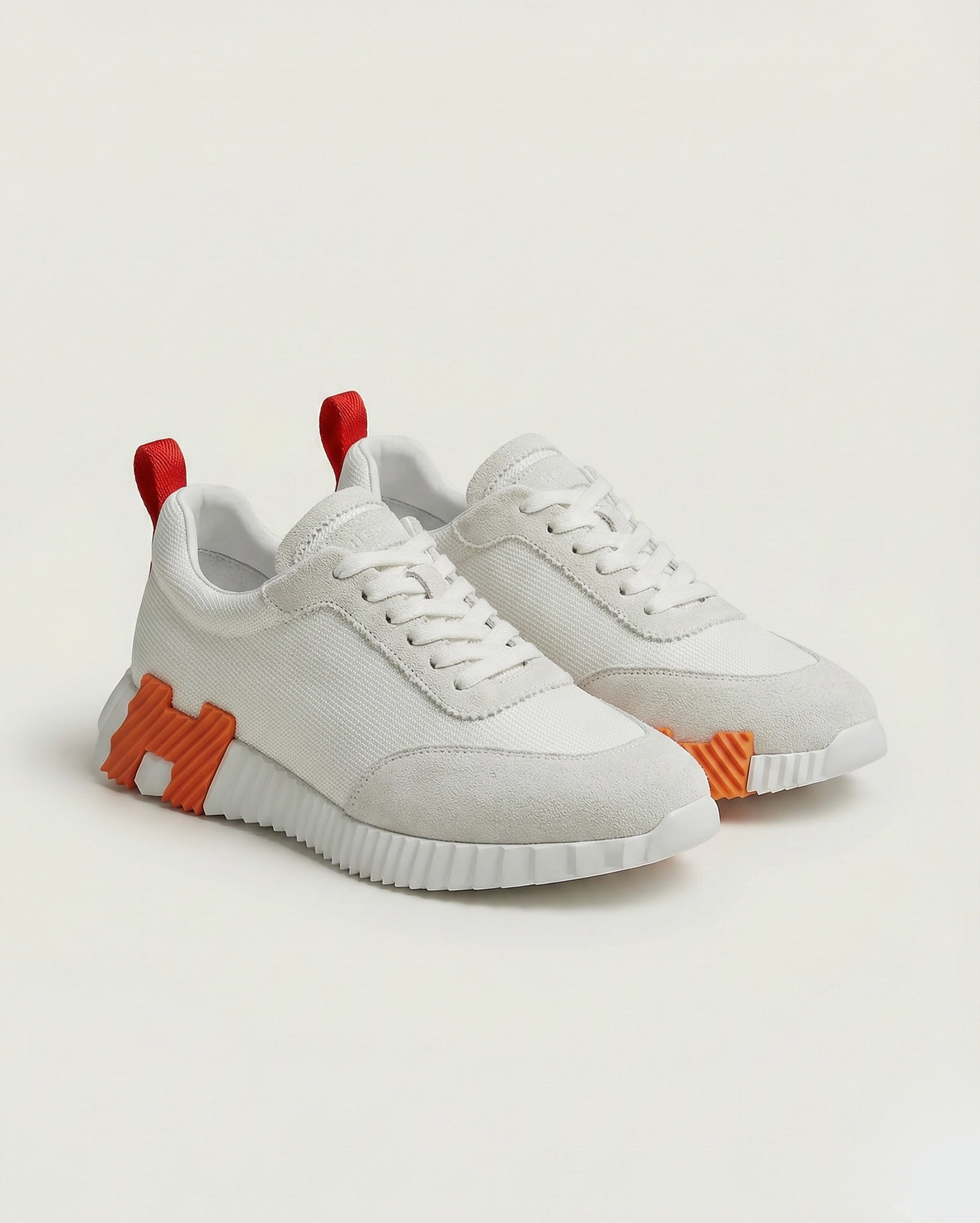 The sneaker is defined by its ultra-lightweight, white serrated rubber sole, featuring the iconic architectural “H” design in signature Hermès Orange. To complete the bold look, a striking red grosgrain pull-tab is added to the heel, providing a final pop of color and functional ease. These sneakers are a testament to modern luxury, blending high-performance materials with a sophisticated, multi-colored palette.