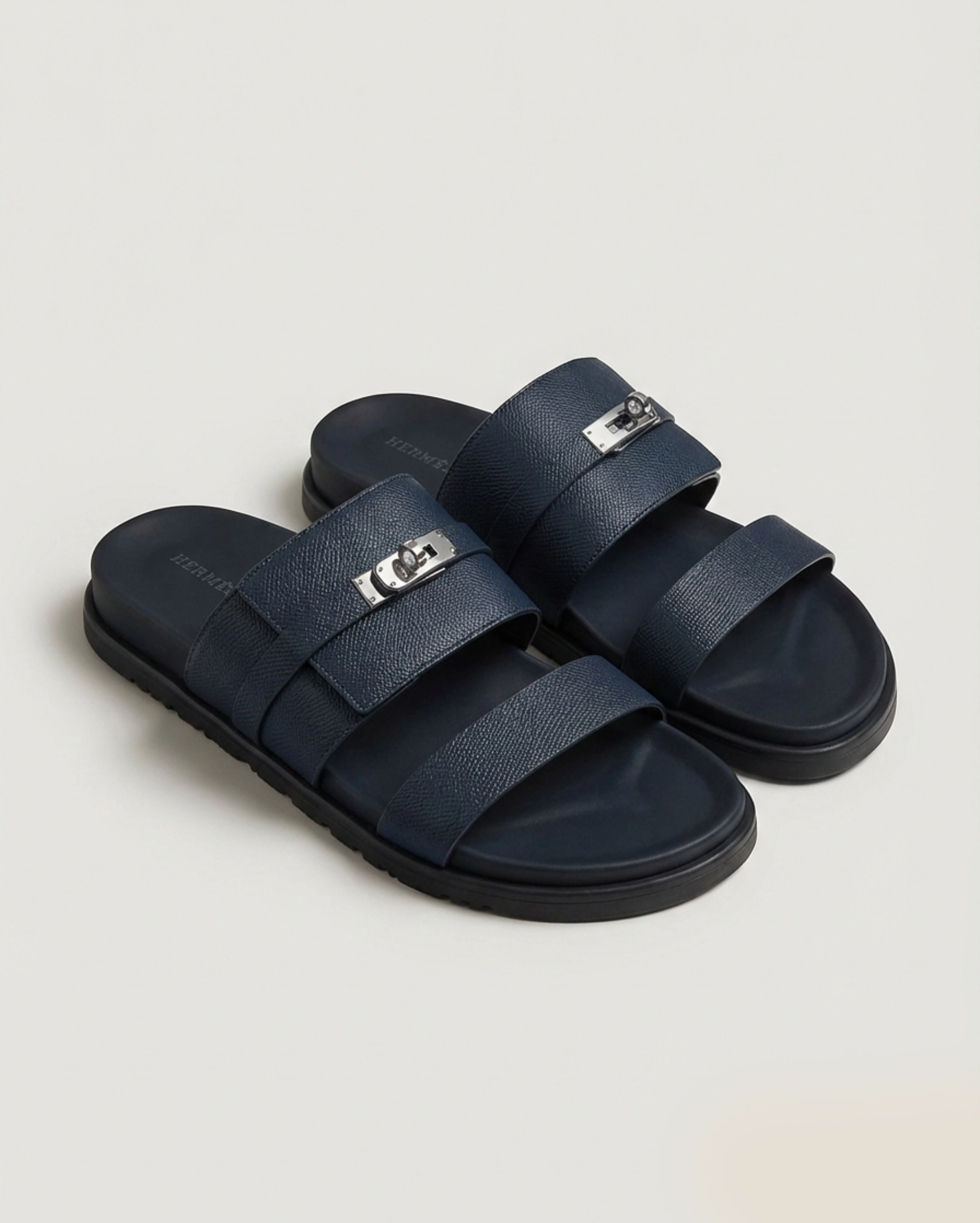 The design is defined by its architectural “H” cut-out vamp and an adjustable instep strap, offering a secure and personalized fit. This iteration features the iconic palladium-plated Kelly buckle—a heritage hallmark of the Maison—providing a refined metallic contrast against the deep navy leather. With its ergonomic black rubber sole and tonal leather-wrapped midsole, the Chypre sandal seamlessly blends high-fashion aesthetics with urban functionality.
