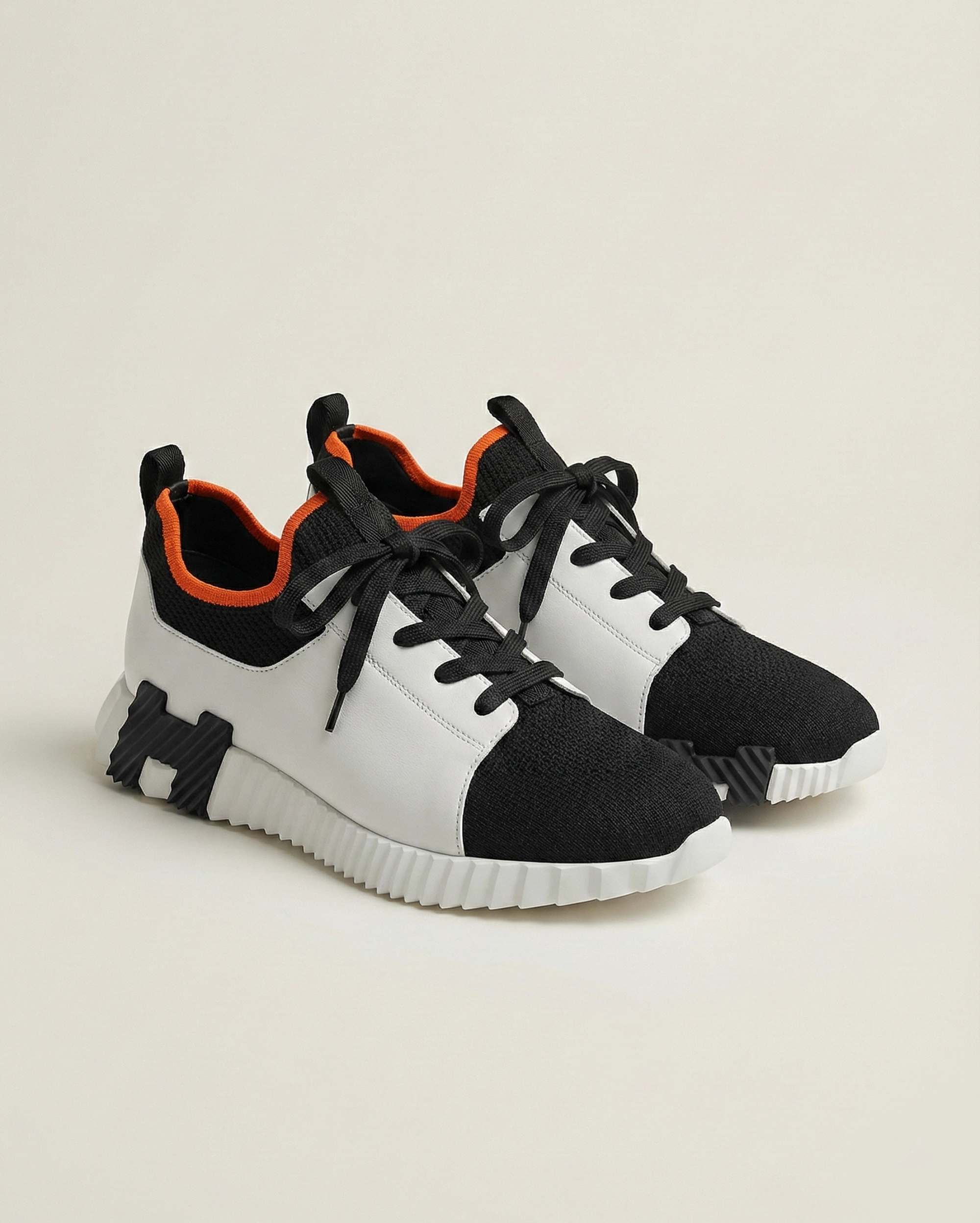 The “Get” sneaker is a contemporary, athletic-inspired silhouette from Hermès that prioritizes an ultra-lightweight feel and a distinct, architectural design. This version features a sharp, high-contrast color palette, combining a black technical knit upper with crisp white leather side panels. The design is punctuated by the Maison’s signature orange piping along the ankle collar and sits atop a white “toothed” rubber sole. A bold black “H” motif is integrated into the lateral heel of the sole, seamlessly blending technical innovation with iconic heritage branding.