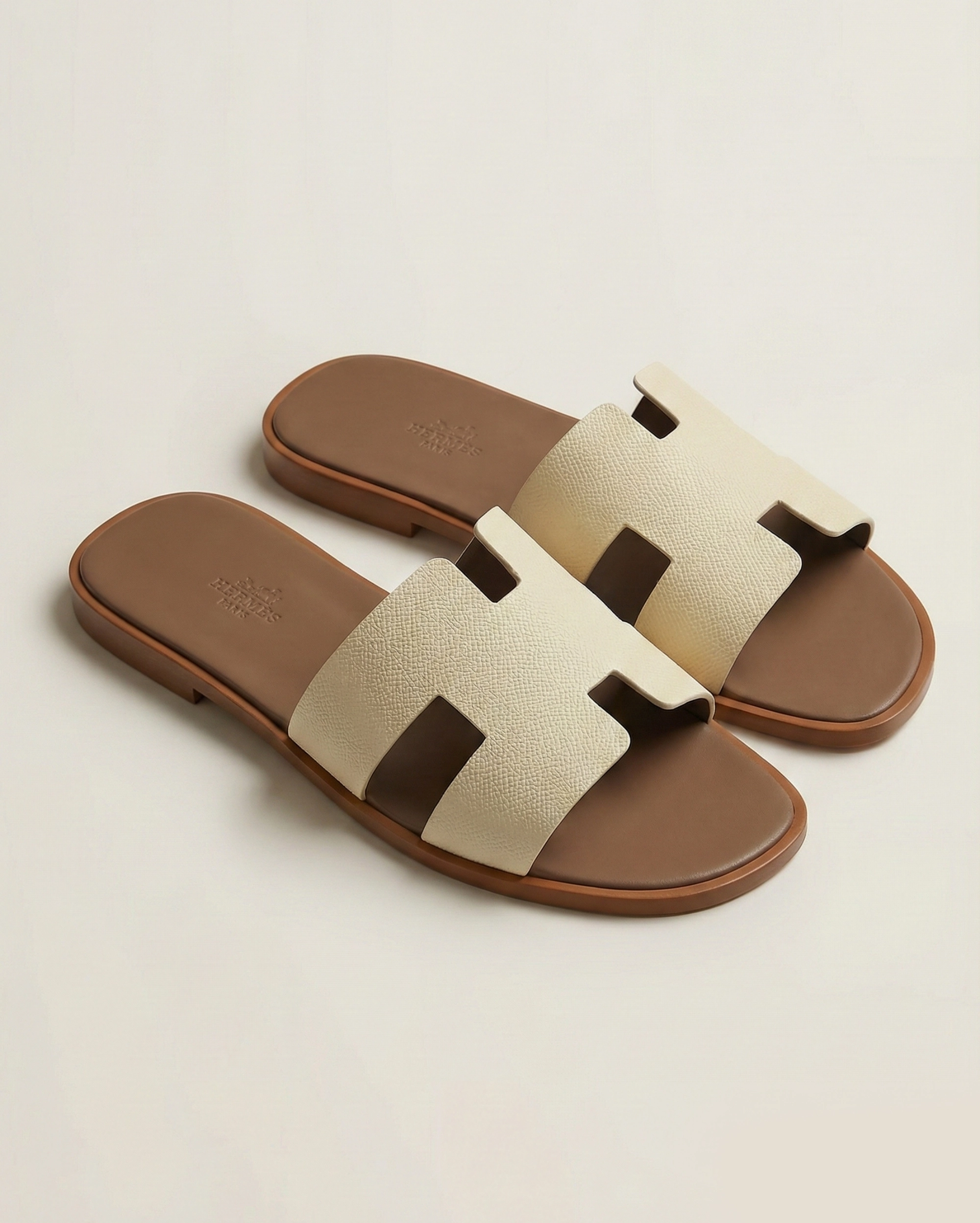 Elevate your summer wardrobe with the definitive icon of effortless luxury: the Hermès Oran Sandal. A signature piece for the RoyalOutfit collection, this sandal is instantly recognizable by its emblematic “H” cut-out vamp, meticulously crafted from premium Epsom calfskin in a refined off-white (Nata/Craie) hue. Known for its structured grain and scratch-resistant durability, the Epsom leather ensures this classic silhouette maintains its pristine shape over time.