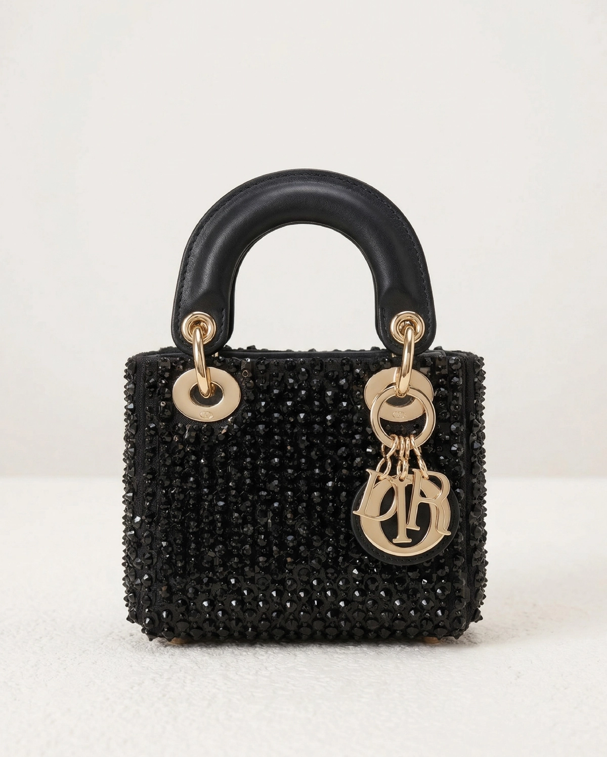 A true jewel of a handbag, the Lady Dior Micro encapsulates the essence of high-fashion elegance and architectural poise. This evening-ready iteration is meticulously adorned with tonal crystals that catch the light from every angle. Featuring the signature rounded handles and the iconic “D.I.O.R.” alphabet charms in a pale gold-finish, this piece is the ultimate symbol of sophisticated glamour.