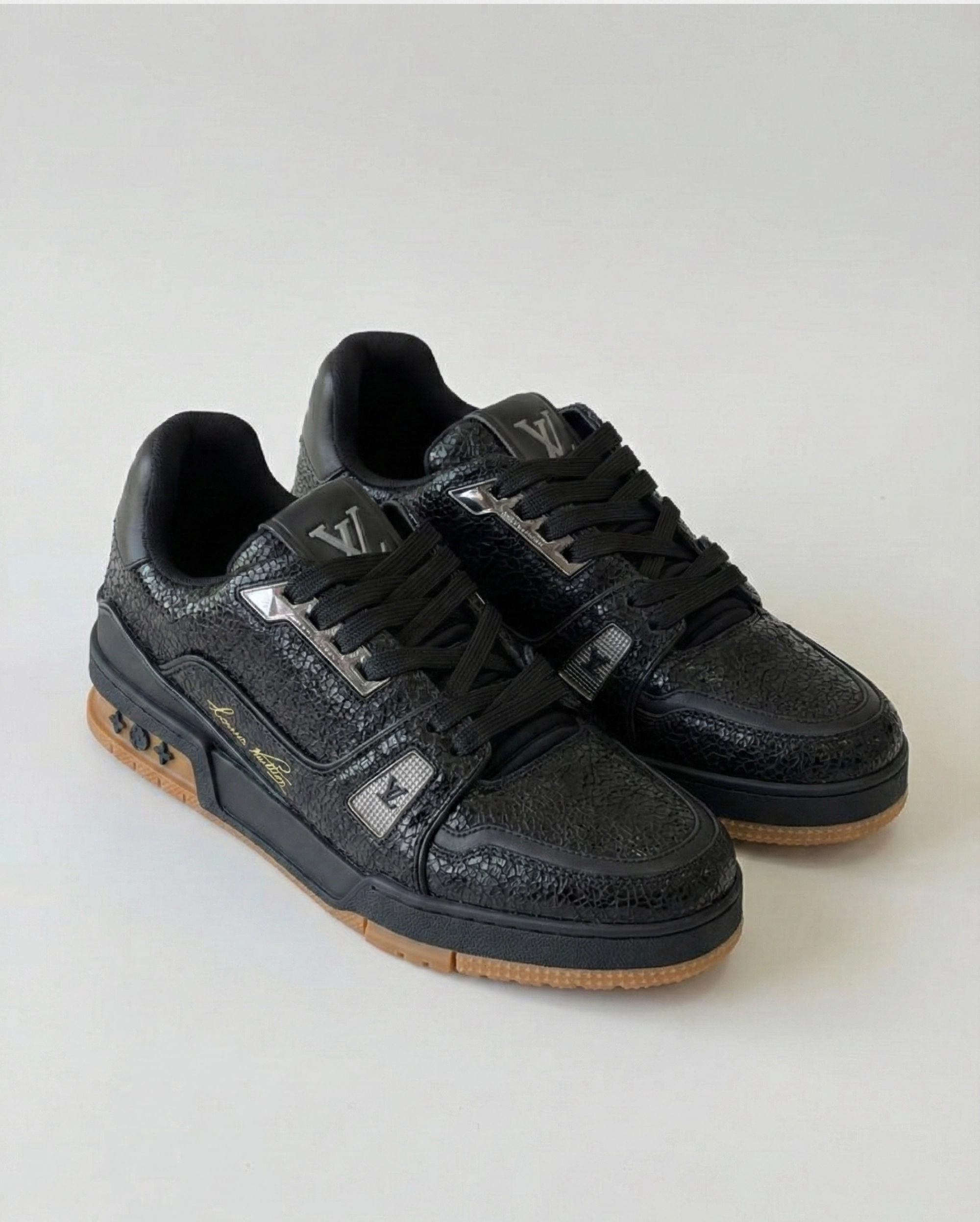 Louis Vuitton Men’s LV Trainer Sneaker – Black Grained Cracked Leather with Gum Outsole
