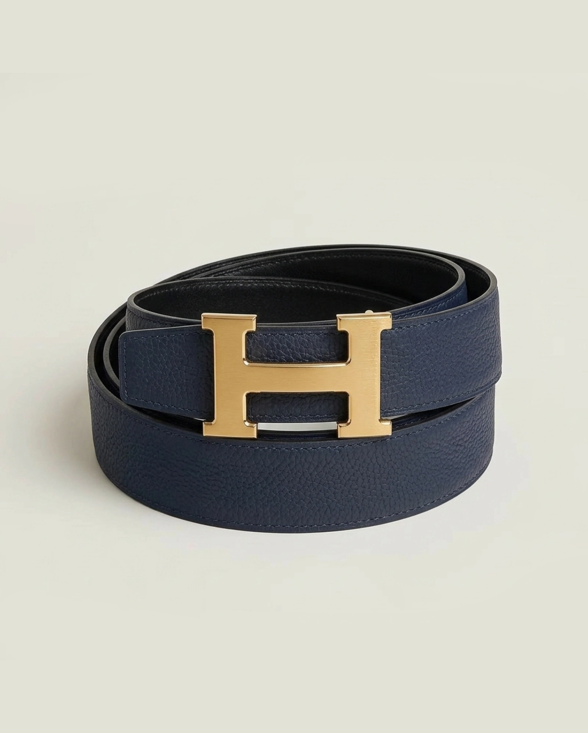 Hermes Constance Navy Blue Leather Belt with Polished Gold Buckle