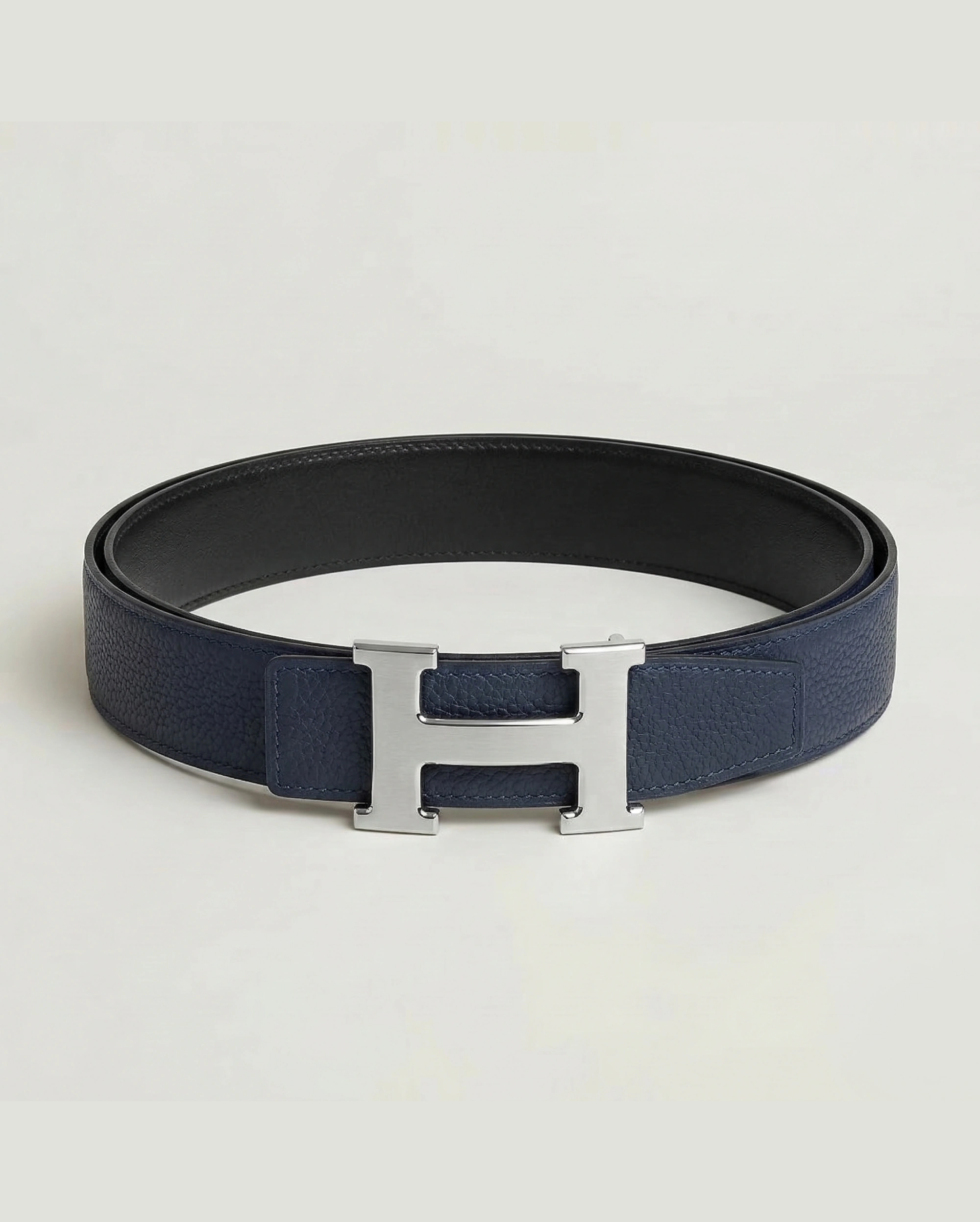 Hermes Constance Navy Blue Leather Belt with Polished Silver Buckle